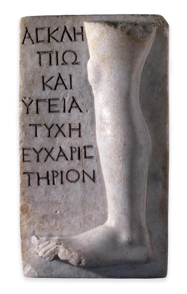The supreme divine physician in Greece was Asclepius: he specialised in curing individuals of sickness and injuries, and enjoyed great popularity from the fifth century B.C. onwards. Anatomical votives in various sanctuaries of Asclepius attest to the god’s healing power and worshippers’ hopes and gratitude. Here, a marble relief depicting a leg, was dedicated to Asclepius and Hygieia as a thank-offering, presumably for a cure already effected. Anatomical dedications such as this also had the effect of putting the body-part cured under the continued protection of a god, and so the same offering could look backward and forward at once.