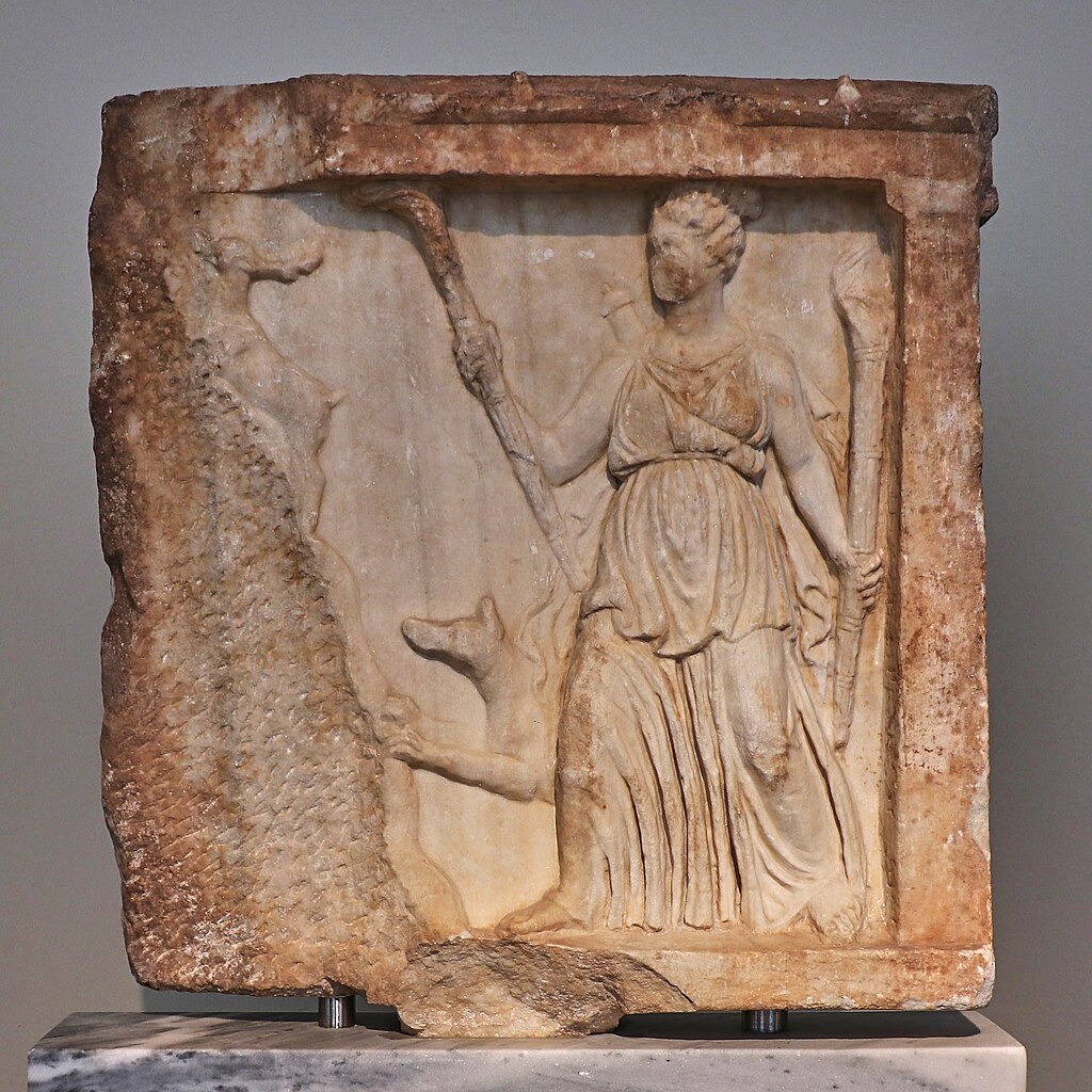 Marble relief depicting Artemis holding two long torches and accompanied by a hunting dog. 4th century B.C., Megara.